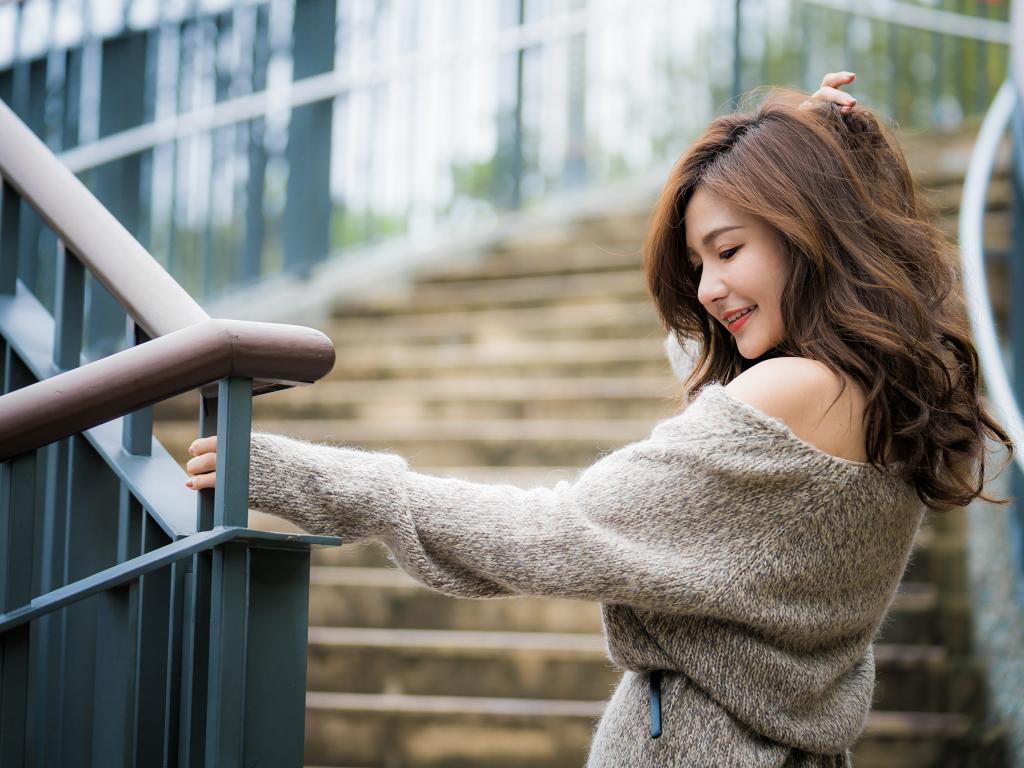 Обои Красивая девушка азиатка в сером свитере на ступеньках