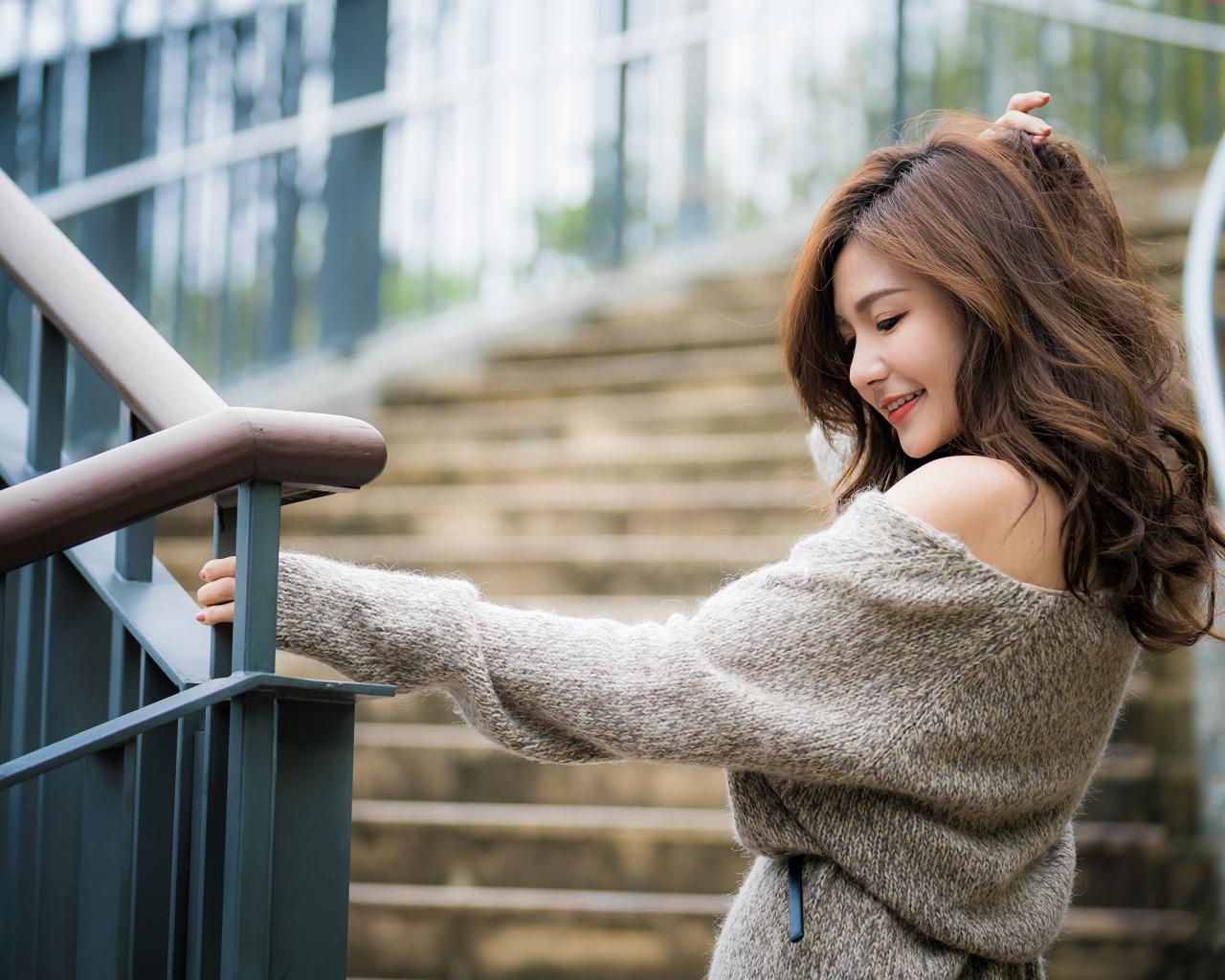 Обои Красивая девушка азиатка в сером свитере на ступеньках