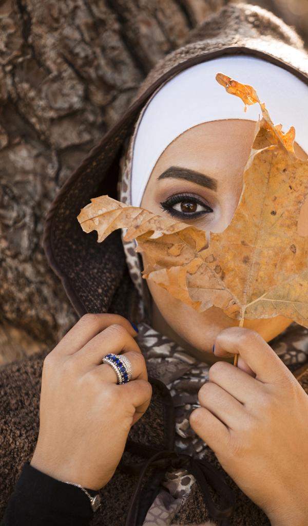 Обои Девушка в пальто с закрывает лицо листом
