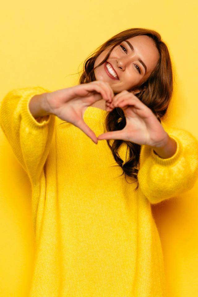 Обои Девушка в желтом свитере показывает сердце руками