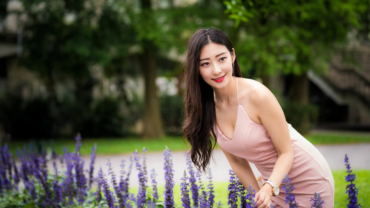 Обои Милая девушка Азиатка в розовом платье у синих цветов
