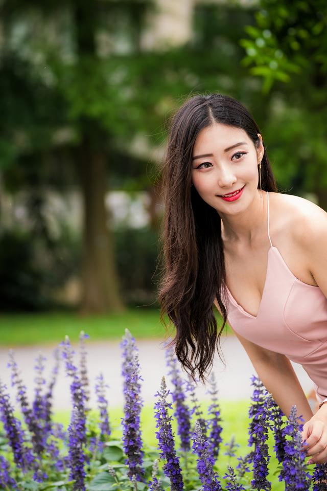 Обои Милая девушка Азиатка в розовом платье у синих цветов