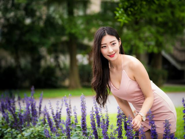 Обои Милая девушка Азиатка в розовом платье у синих цветов