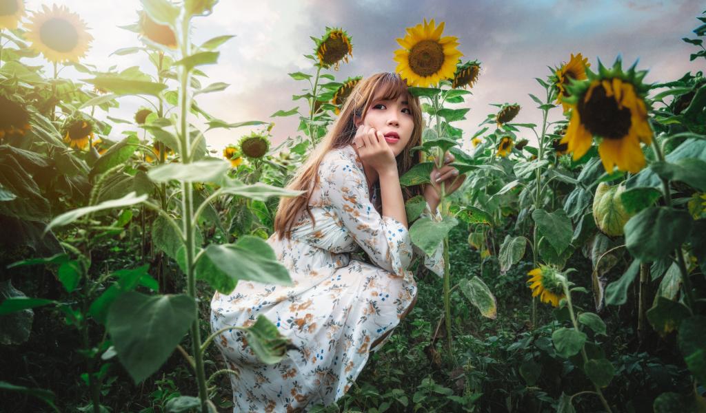 Обои Красивая девушка азиатка на поле с подсолнухами