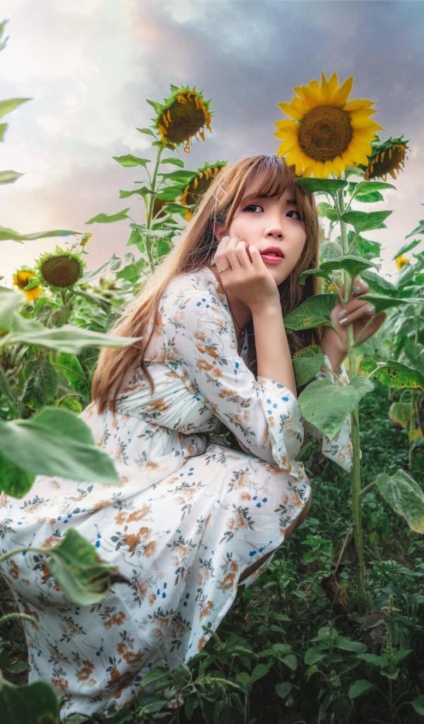 Обои Красивая девушка азиатка на поле с подсолнухами