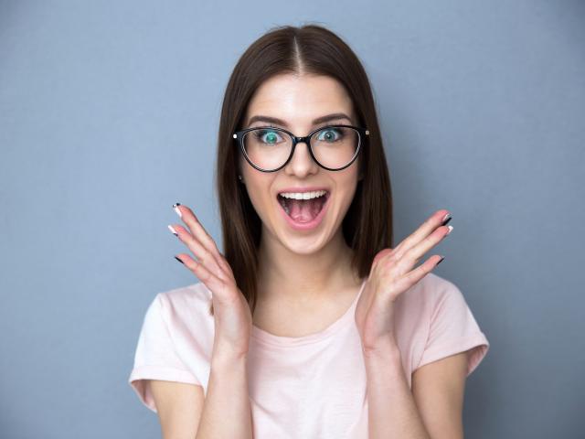 Обои Радостная девушка в очках на сером фоне