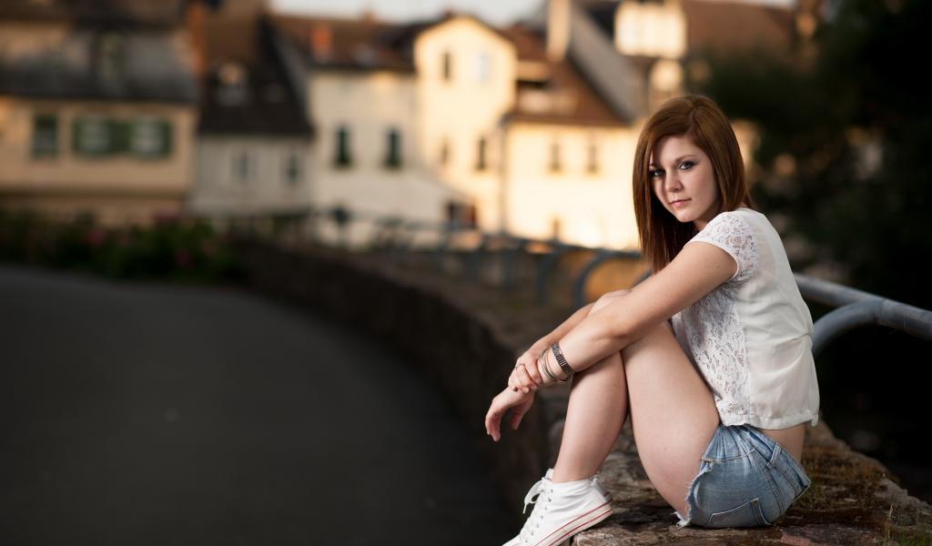 Обои Молодая девушка с короткими волосами сидит на улице