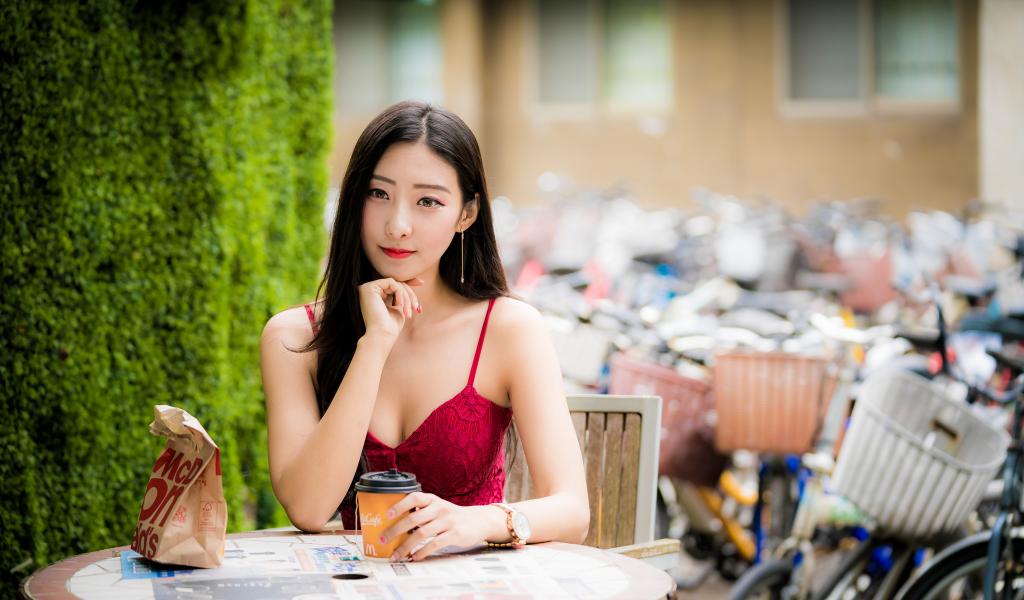 Обои Милая девушка азиатка сидит за столиком в кафе