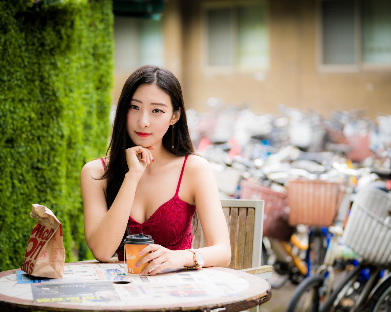 Обои Милая девушка азиатка сидит за столиком в кафе