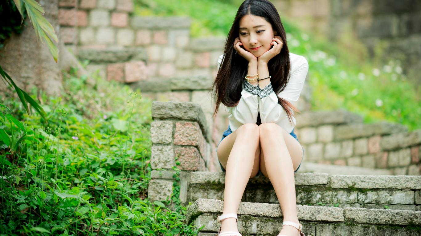 Обои Мечтательная девушка азиатка сидит на ступеньках