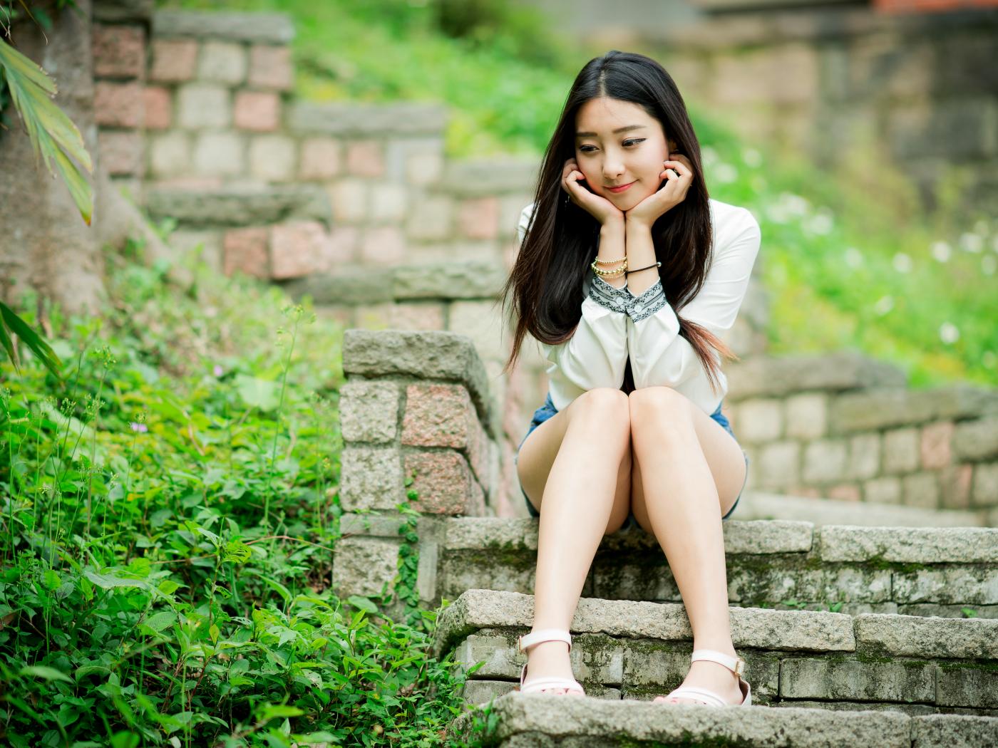 Обои Мечтательная девушка азиатка сидит на ступеньках