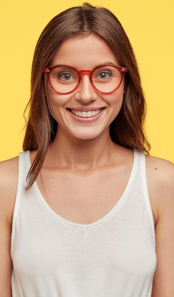 Обои Улыбающаяся девушка в очках на желтом фоне