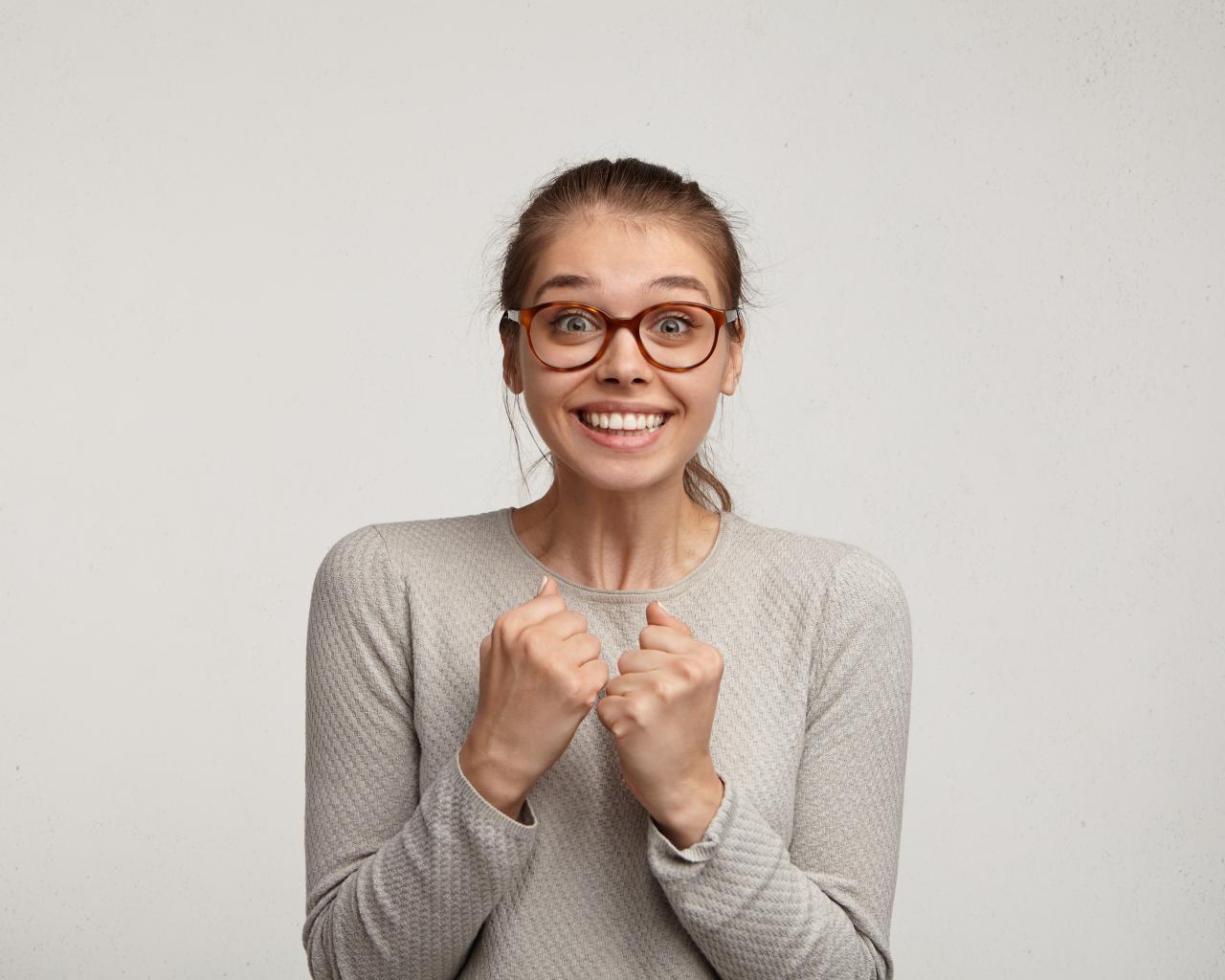 Обои Радостная девушка в очках для зрения на сером фоне