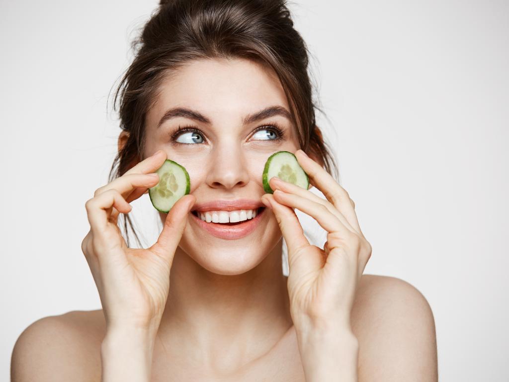 Обои Голубоглазая девушка прикладывает огурцы к лицу