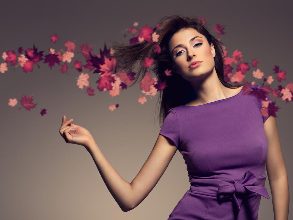 Обои Красивая девушка в фиолетовом платье на сером фоне
