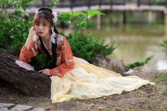 Обои Красивая девушка азиатка сидит на земле у дерева