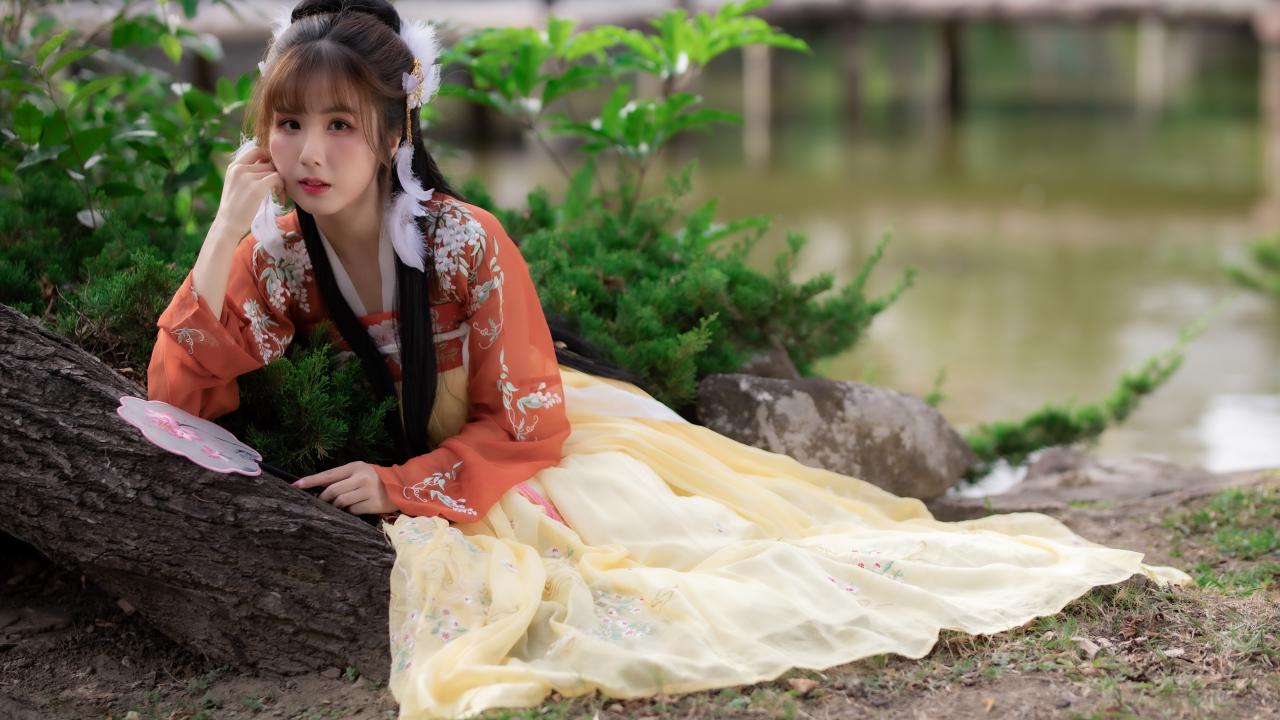 Обои Красивая девушка азиатка сидит на земле у дерева