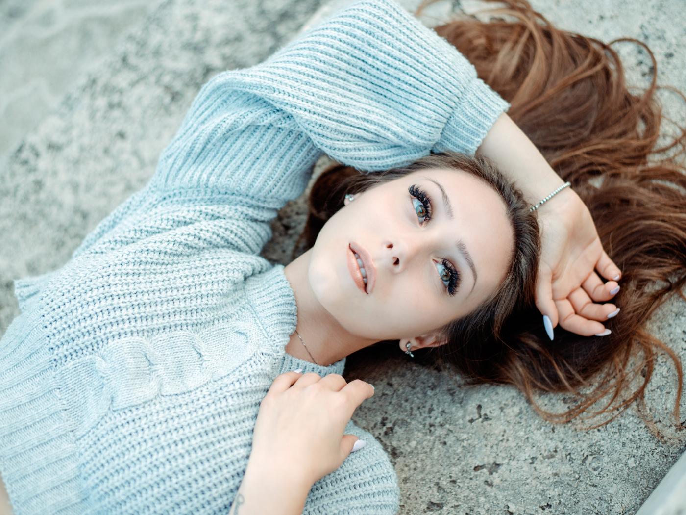 Обои Длинноволосая девушка в голубом свитере лежит на земле