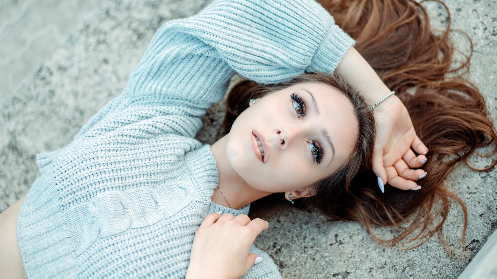 Обои Длинноволосая девушка в голубом свитере лежит на земле