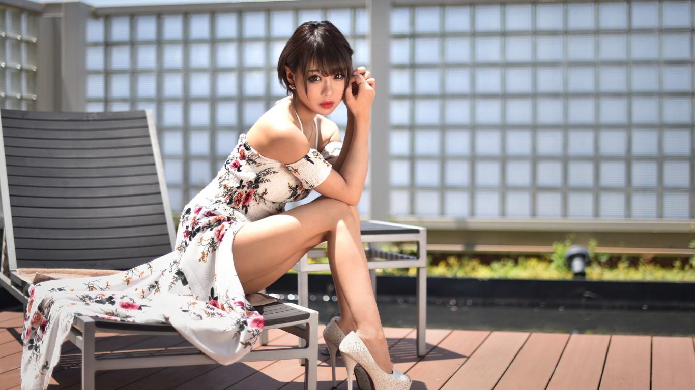 Обои Красивая девушка азиатка сидит на шезлонге