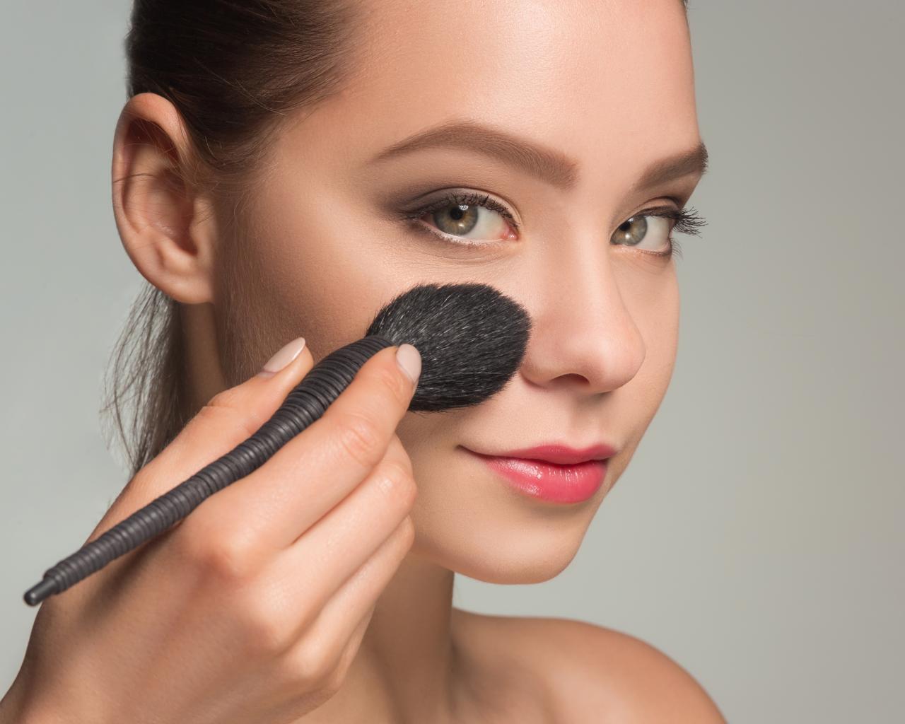 Обои Красивой девушке наносят макияж на лицо кистью