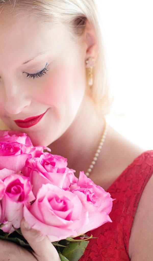 Обои Блондинка с закрытыми глазами нюхает букет роз