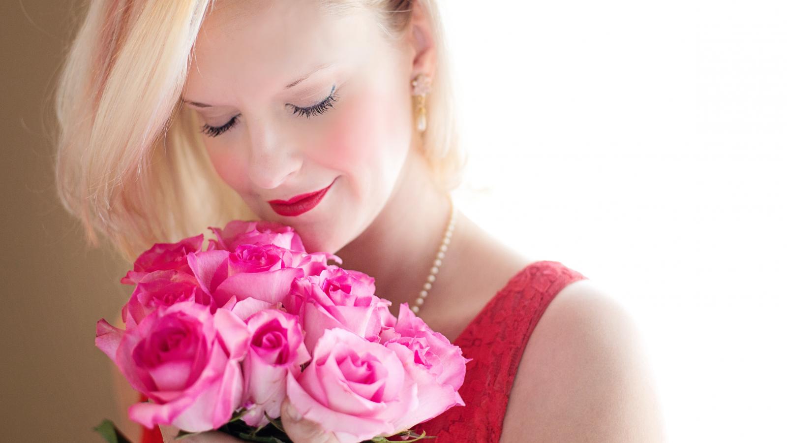 Обои Блондинка с закрытыми глазами нюхает букет роз