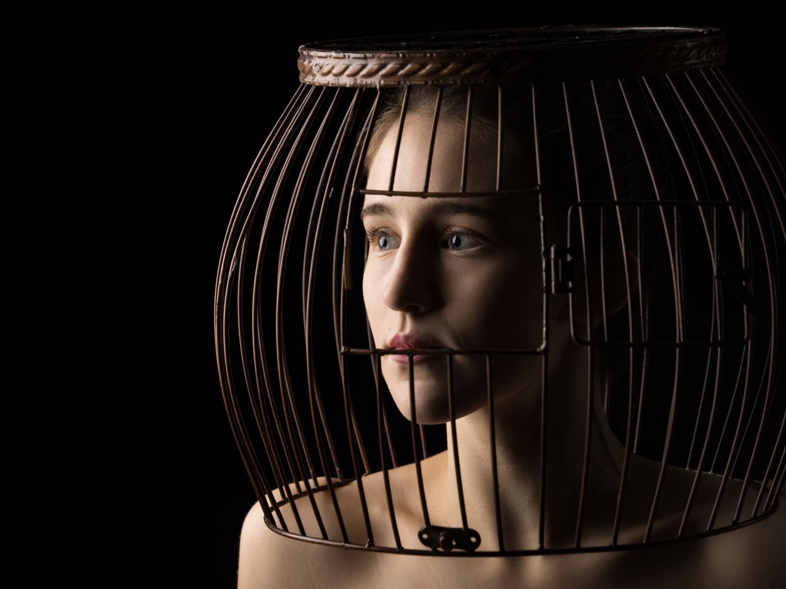 Обои Молодая девушка с клеткой на голове