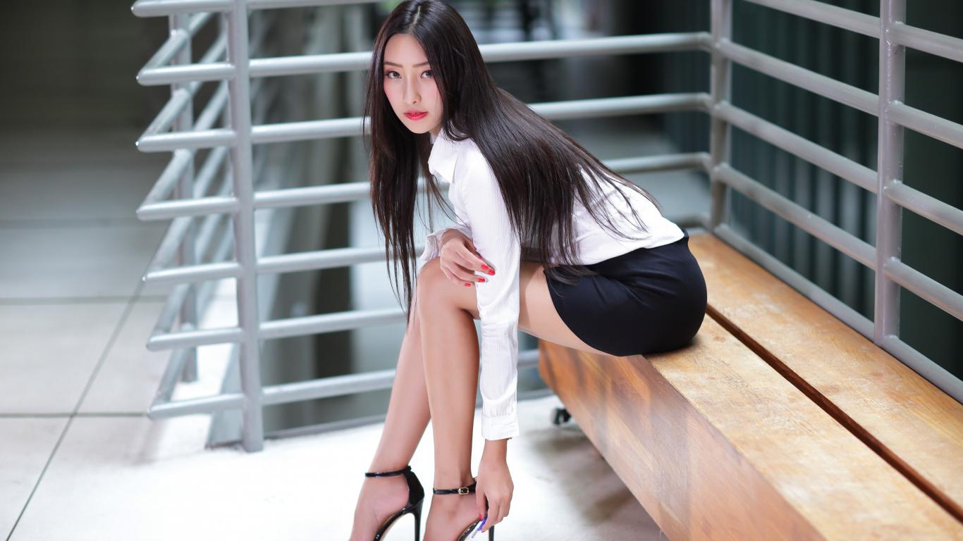 Обои Стильная деловая девушка азиатка сидит на лавке