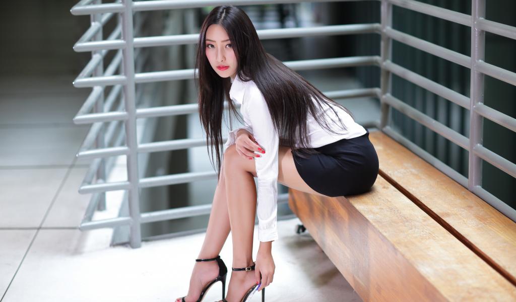 Обои Стильная деловая девушка азиатка сидит на лавке