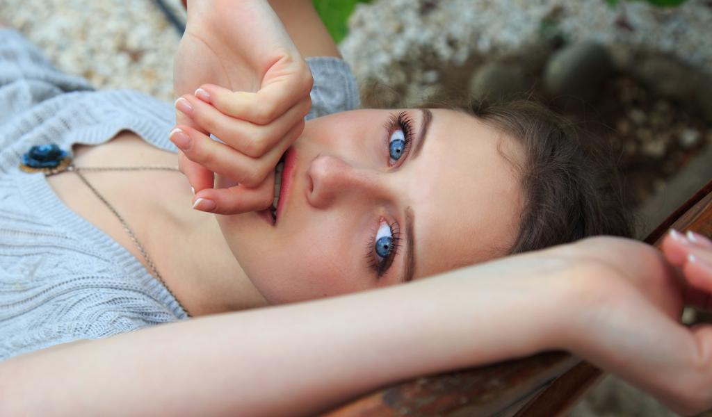 Обои Красивая голубоглазая девушка с рукой у рта