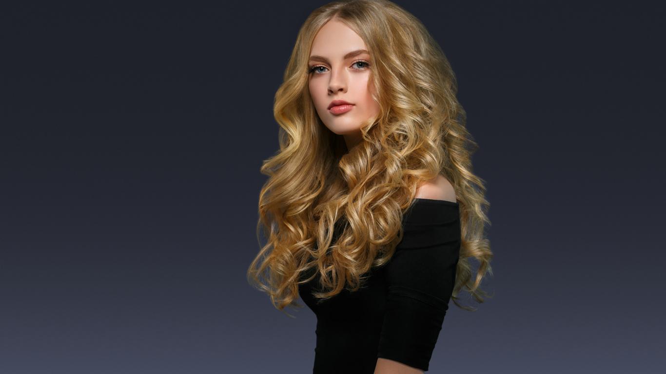 Обои Молодая блондинка с красивыми длинными волосами в черном платье