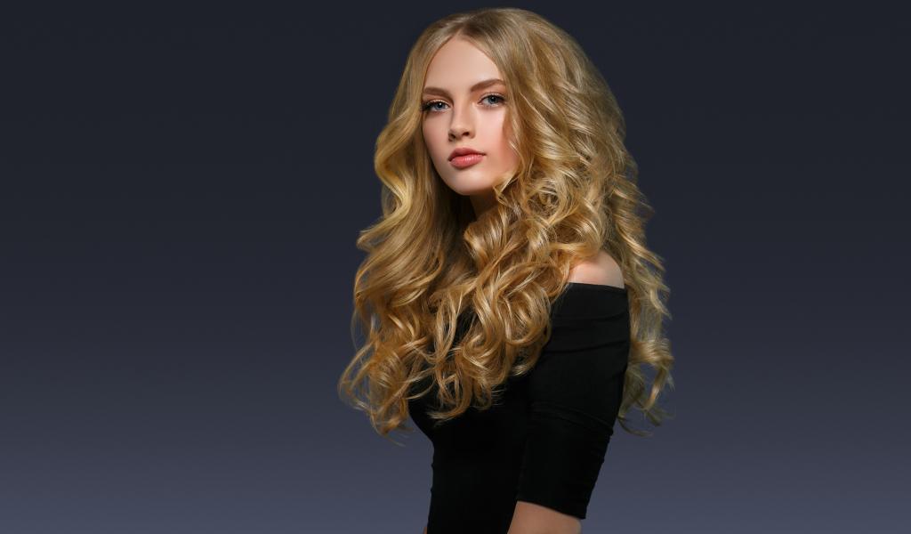 Обои Молодая блондинка с красивыми длинными волосами в черном платье