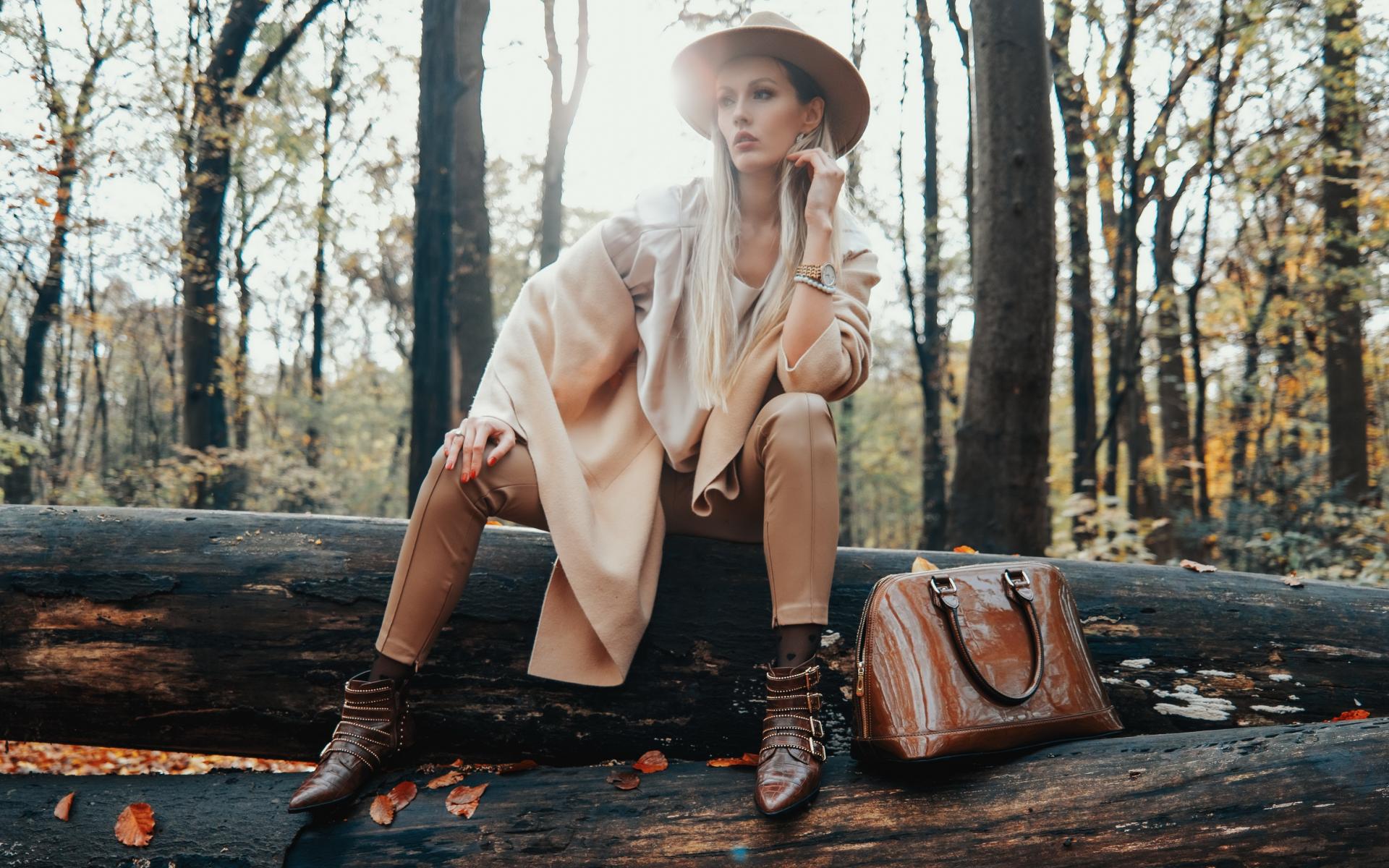 Обои Девушка в пальто сидит на упавшем дереве в лесу
