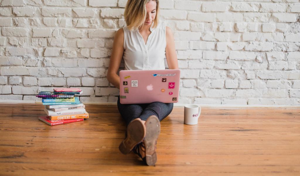 Обои Молодая девушка студентка с ноутбуком и книгами у стены