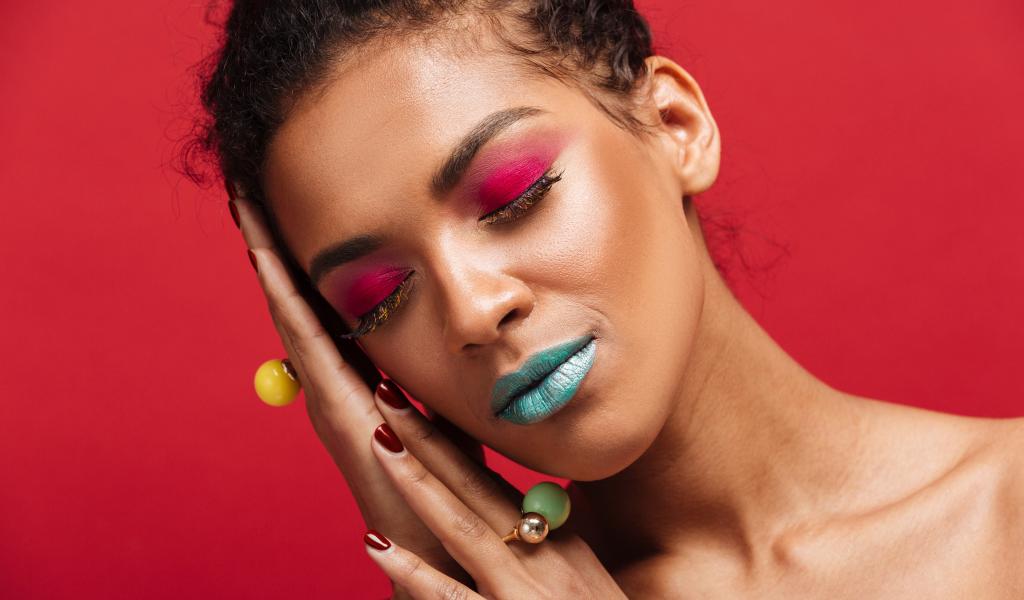 Обои Девушка с ярким макияжем на красном фоне