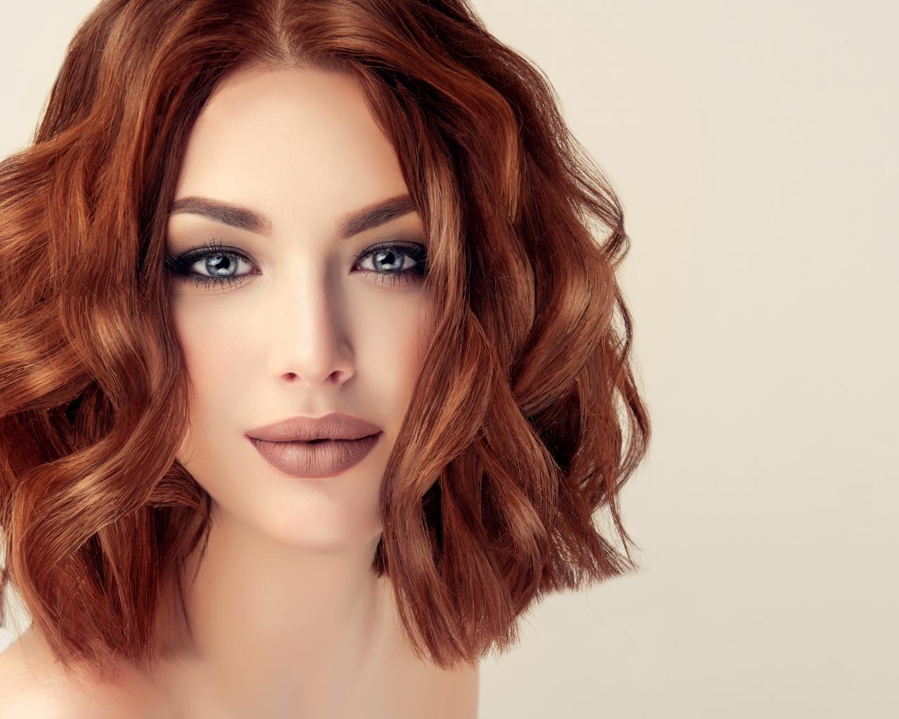 Обои Рыжеволосая голубоглазая девушка на сером фоне