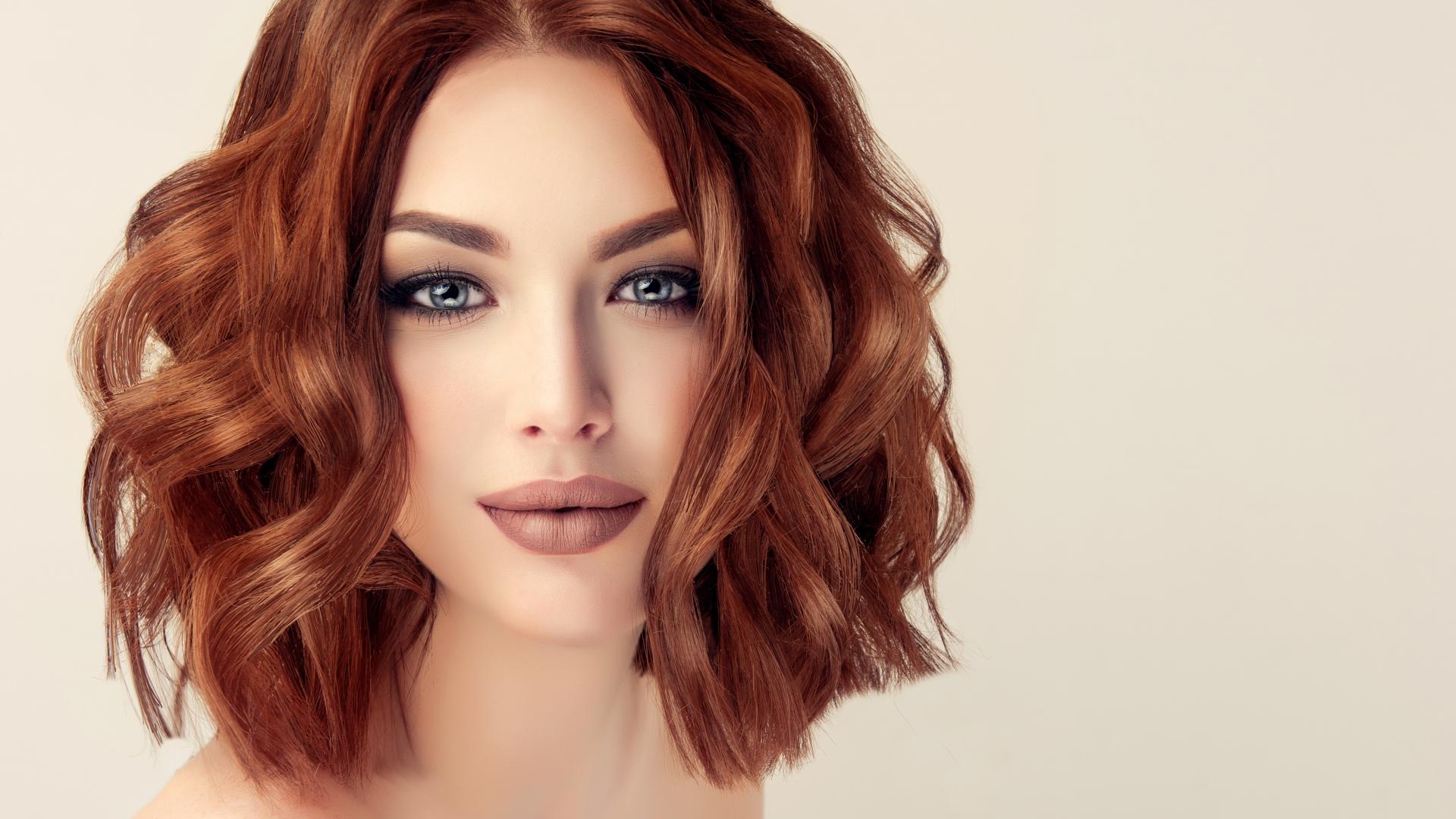 Обои Рыжеволосая голубоглазая девушка на сером фоне