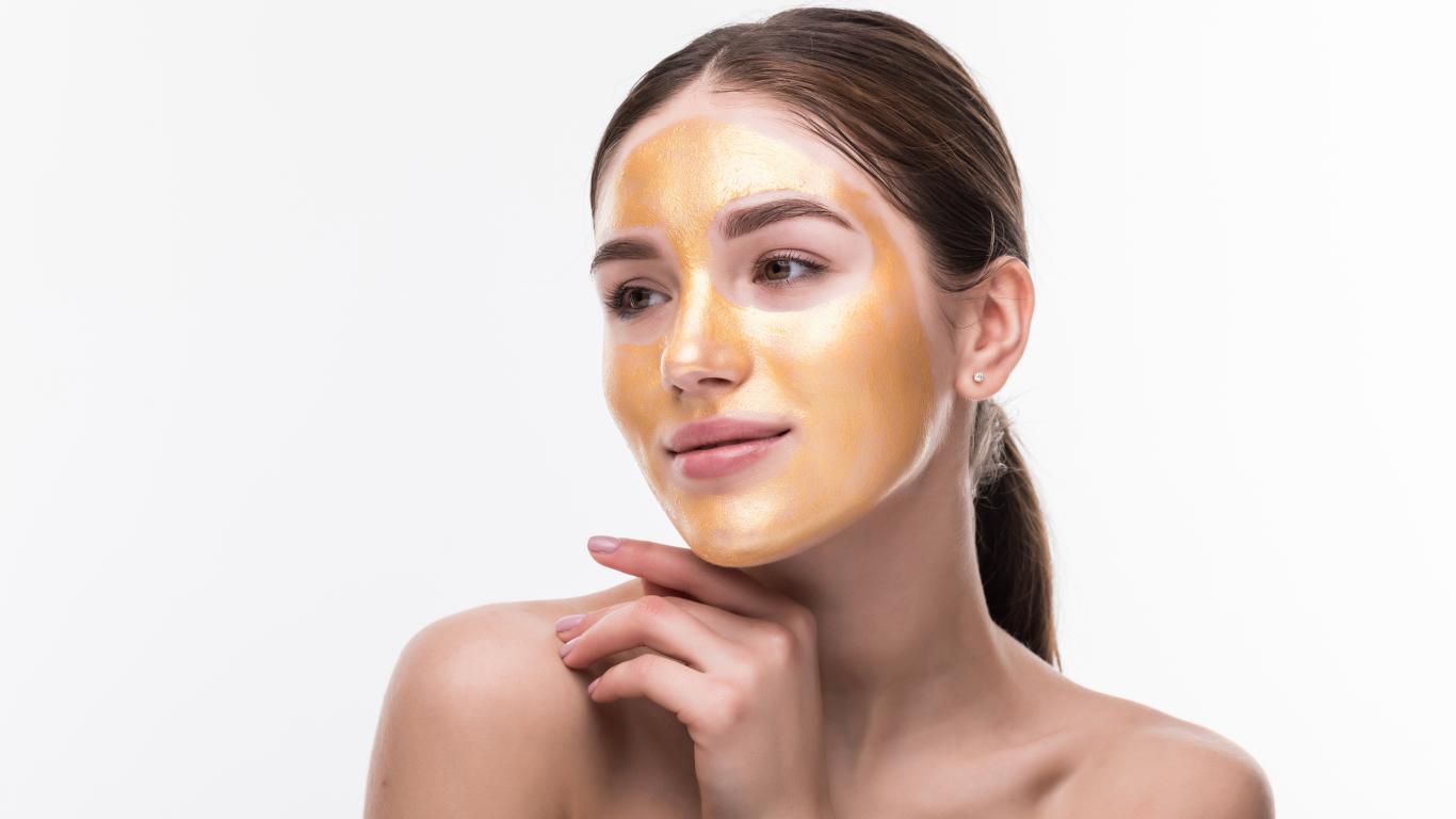 Обои Молодая девушка без макияжа с золотой маской на лице