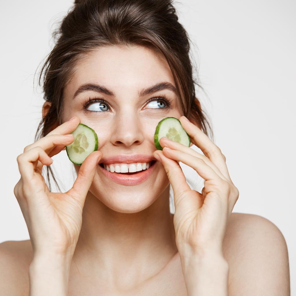 Обои Улыбающаяся девушка с огурцами на лице