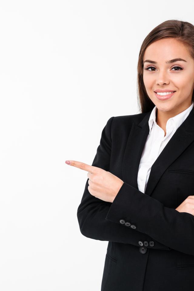 Обои Улыбающаяся девушка в черном пиджаке на белом фоне