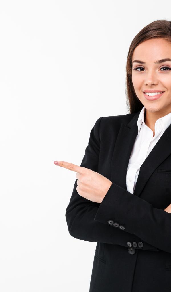 Обои Улыбающаяся девушка в черном пиджаке на белом фоне