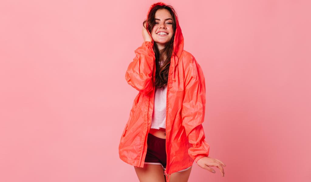 Обои Улыбающаяся девушка в плаще на розовом фоне