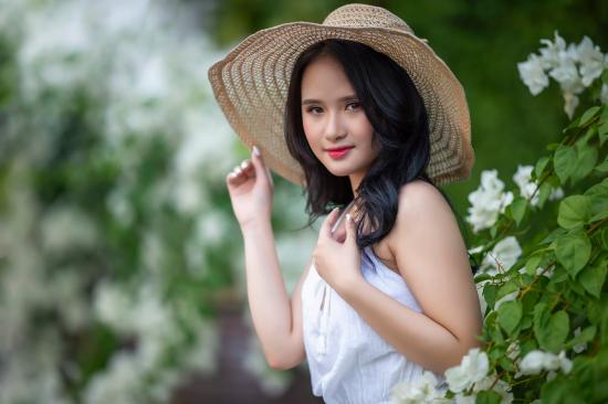 Обои Девушка азиатка в большой шляпе у зеленого куста