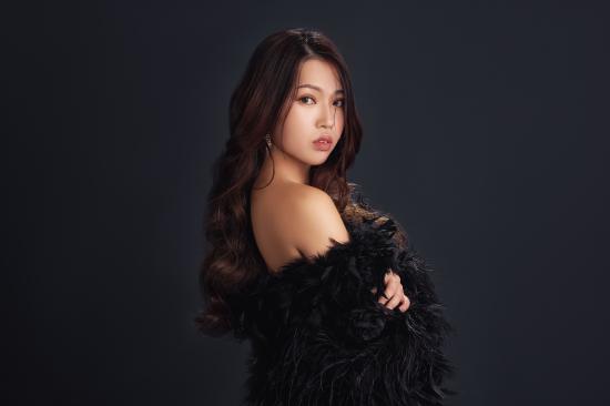 Обои Милая девушка азиатка в черном наряде на сером фоне