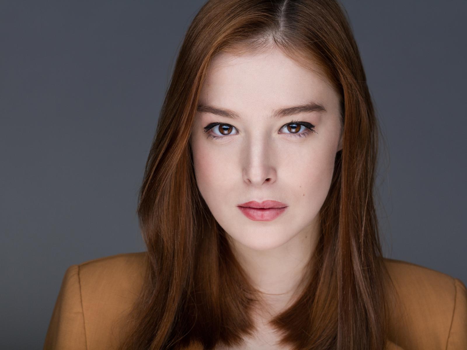 Обои Рыжеволосая молодая девушка на сером фоне