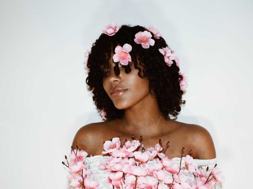 Обои Темнокожая девушка в розовых цветах на сером фоне