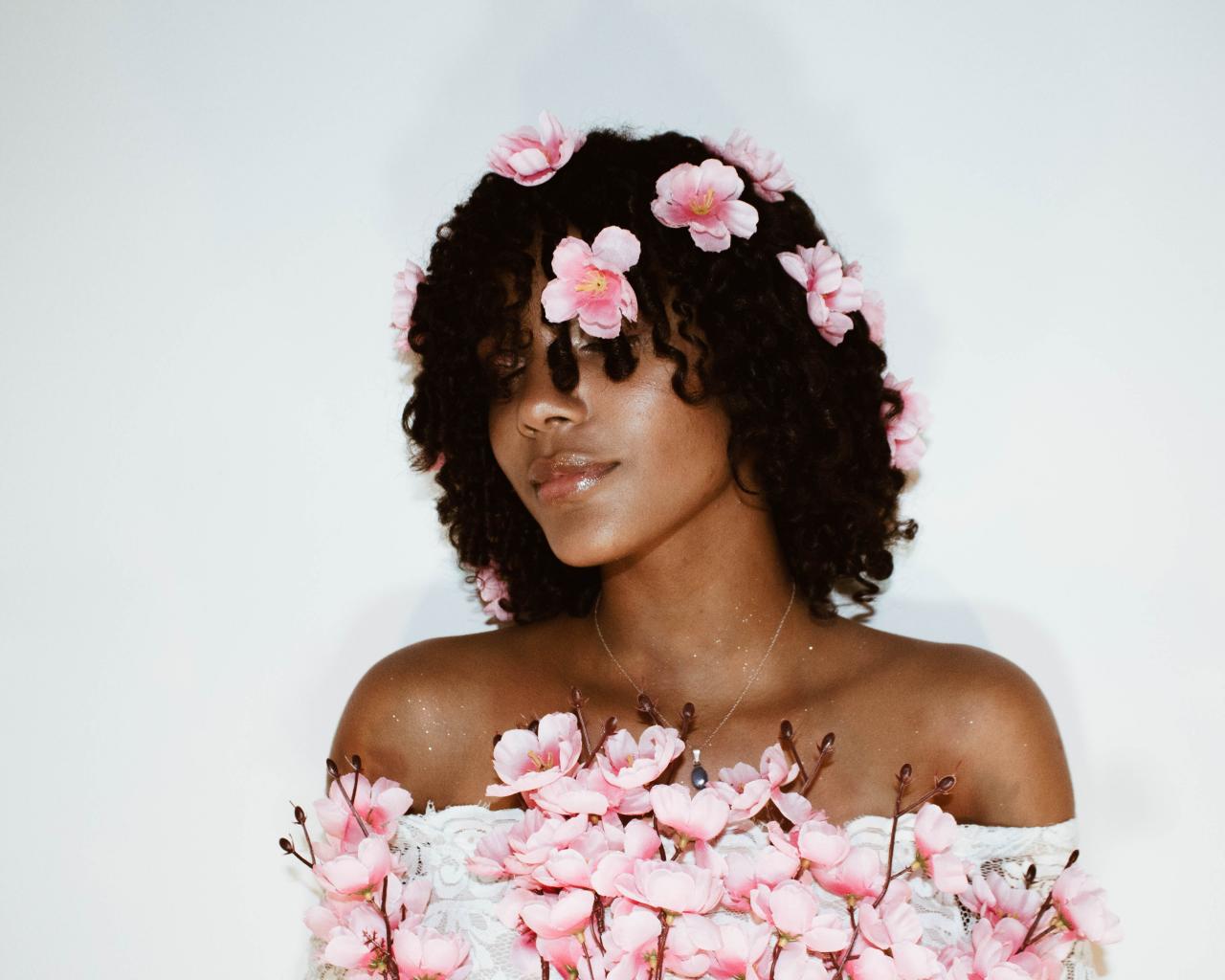 Обои Темнокожая девушка в розовых цветах на сером фоне