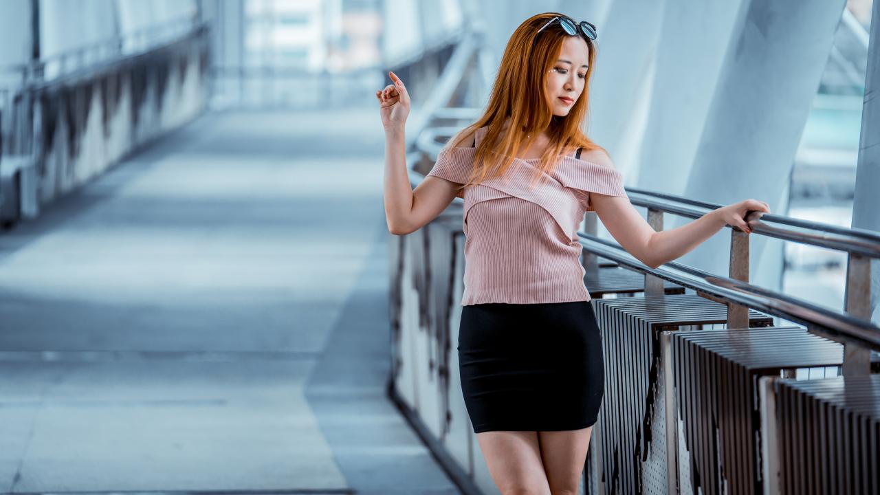 Обои Красивая рыжеволосая девушка азиатка в черной юбке