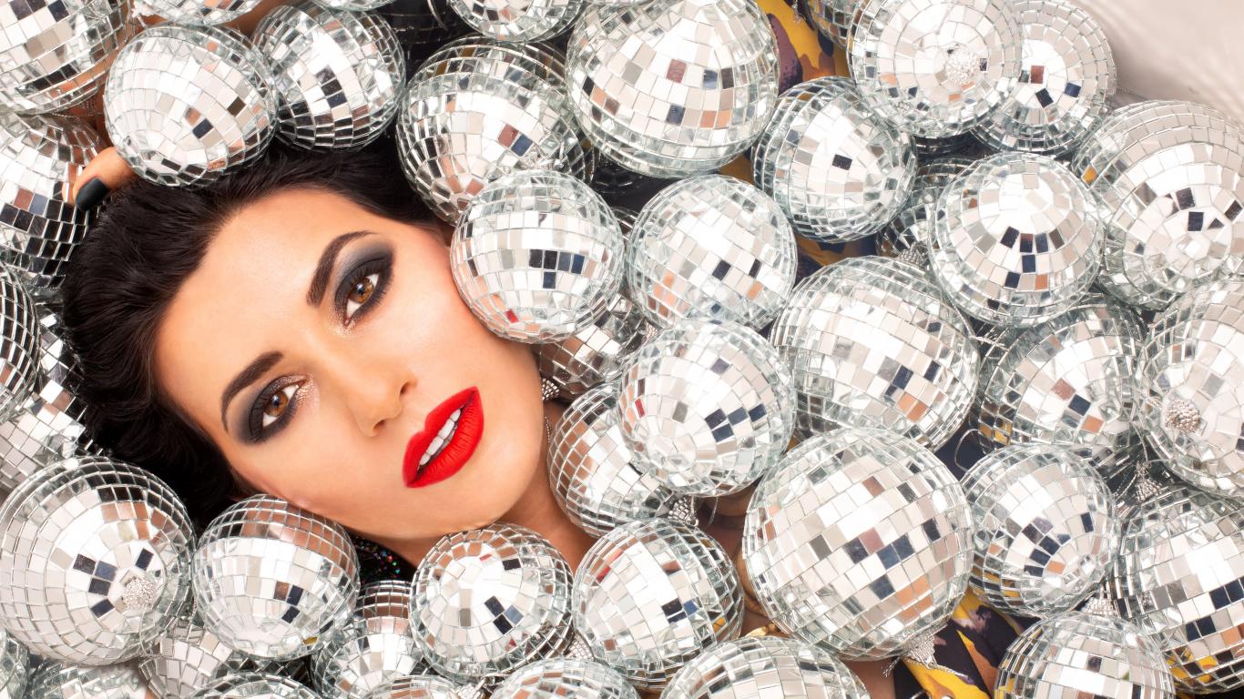 Обои Молодая девушка усыпана блестящими шарами